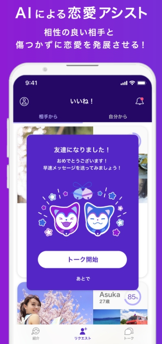 また、出会いから交際まで3つのAI機能がサポートしてくれる点も他アプリとの大きな違いです。